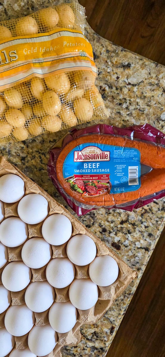 The first time we tried this idea, we used golden potatoes, eggs, and smoked sausage.